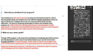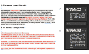 (↑「How will you contribute?(どう貢献できる?)」という質問に対し、「カメルーンでの現場経験」と「大学院で学ぶ理論」を“混ぜる”という答え方を、友人と模索しています)
